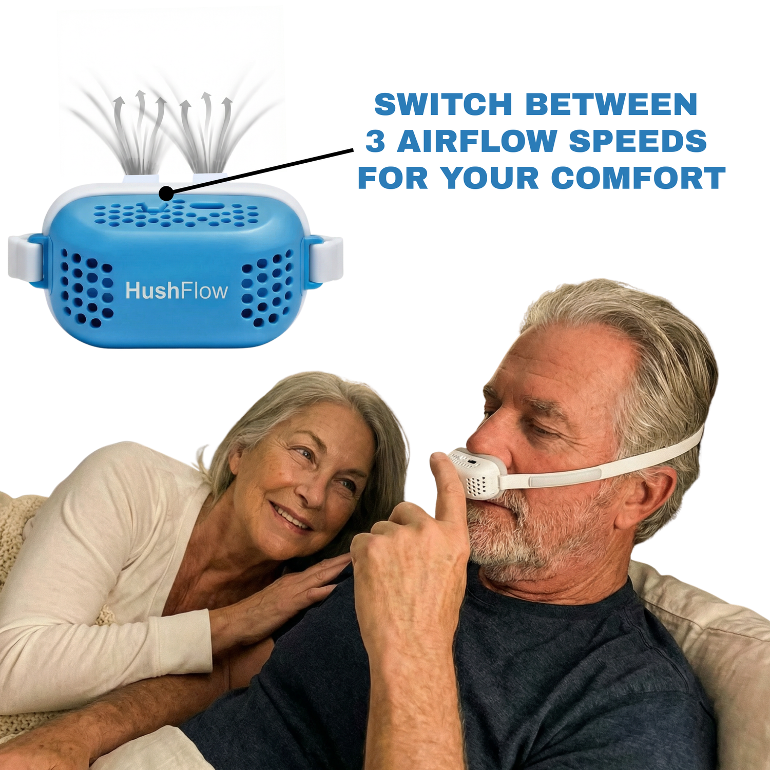Snoring doesn’t just make noise—it breaks sleep for both of you. When snoring and nighttime breathing interruptions keep pulling you out of deep sleep, you wake up tired no matter how long you stayed in bed. HushFlow supports smoother nasal airflow with adjustable levels, helping reduce the vibrations that trigger snoring so nights feel calmer and mornings feel easier.