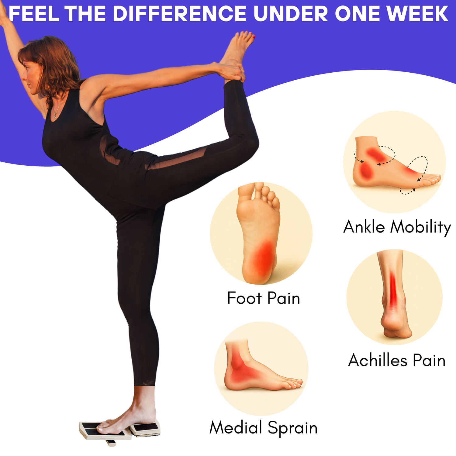 Stability + mobility. Controlled tilts improve joint control while easing load on the plantar fascia.
